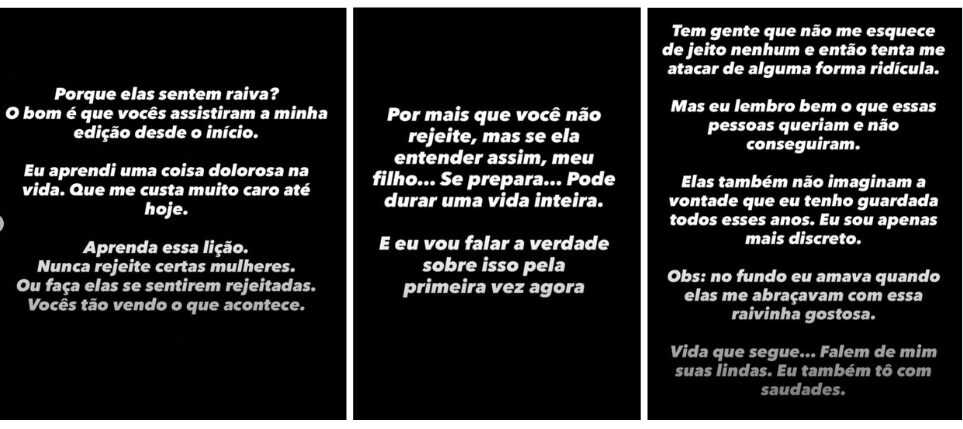 Do lado de fora, Fiuk usou seu perfil oficial no Instagram para rebater as críticas. Em tom enigmático, e cheio de indiretas, o artista sugeriu que os ataques teriam uma motivação pessoal antiga. “Aprenda essa lição. Nunca rejeite certas mulheres. Ou faça elas se sentirem rejeitadas”, escreveu ele nos stories.