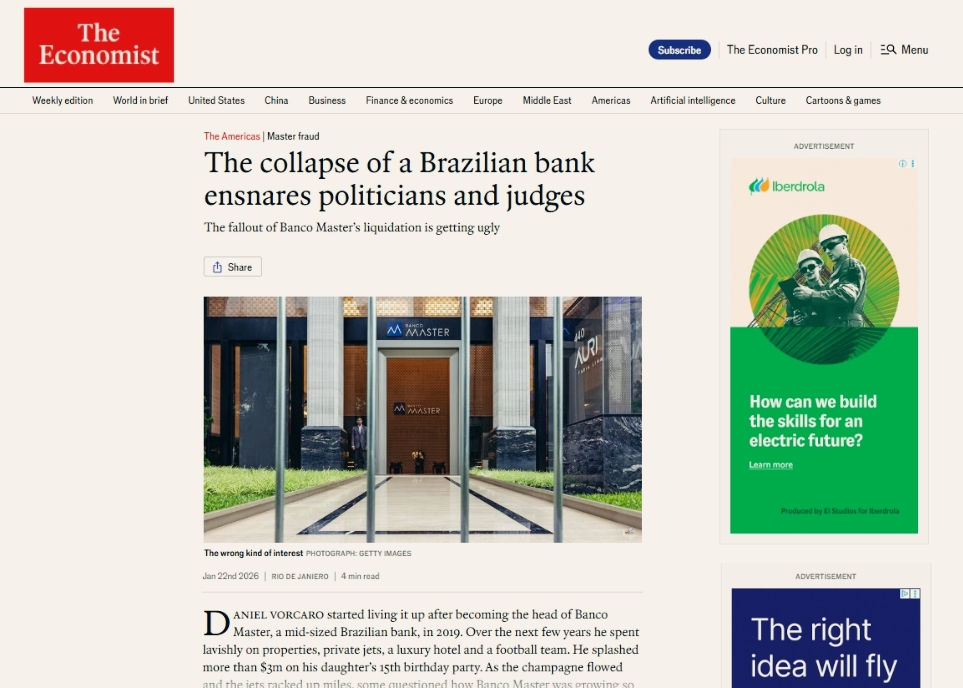 A revista britânica disse que o ministro do STF Dias Toffoli arquivou investigações anticorrupção envolvendo a elite de Brasília. O magistrado teria viajado em jatinho com um advogado do Banco Master quase ao mesmo tempo em que o sistema de sorteio do STF o designou para ser relator do caso.