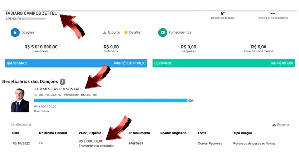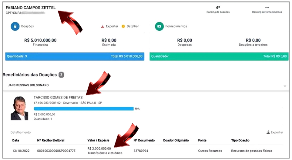 Alvo da Polícia Federal, o pastor evangélico Fabiano Campos Zettel, cunhado de Daniel Vorcaro, destinou R$ 2 milhões à campanha de Tarcísio de Freitas (Republicanos), atual governador de São Paulo, e R$ 3 milhões à campanha de reeleição do ex-presidente Jair Bolsonaro (PL) nas eleições de 2022. As doações somaram R$ 5 milhões, o que o colocou como o sexto maior doador naquele pleito, segundo dados do Tribunal Superior Eleitoral (TSE).