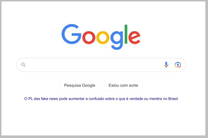 O Google incluiu em sua página inicial o texto “O PL das fake news pode aumentar a confusão sobre o que é verdade ou mentira no Brasil”. A frase é linkada a um artigo assinado pelo diretor de Relações Governamentais e Políticas Públicas da empresa no Brasil, Marcelo Lacerda, que defende que o PL (projeto de lei) 2.630 de 2020 “acaba protegendo quem produz desinformação, resultando na criação de mais desinformação”.