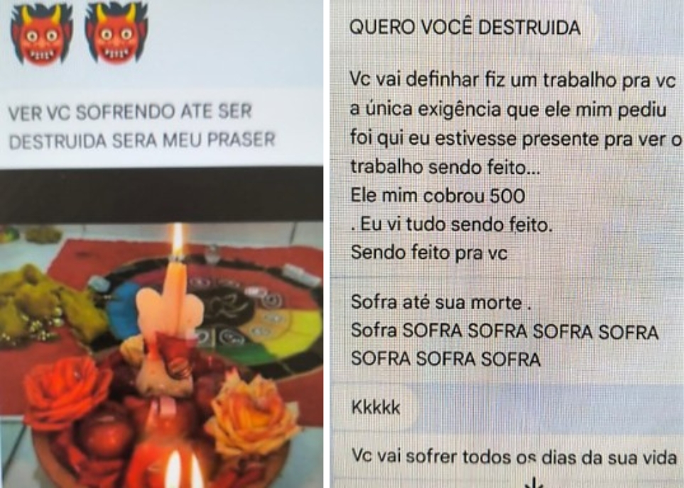 Dentre as mensagens, há a menção a um suposto trabalho de feitiçaria que o homem teria feito contra a ex-companheira. De acordo com as mensagens divulgadas pela Polícia Civil, o preso teria pago R$ 500,00 para que o trabalho fosse realizado. A única exigência seria acompanhar o processo de perto. Nas mensagens, ele também afirma que a mulher vai “definhar” com “dores na barriga”.