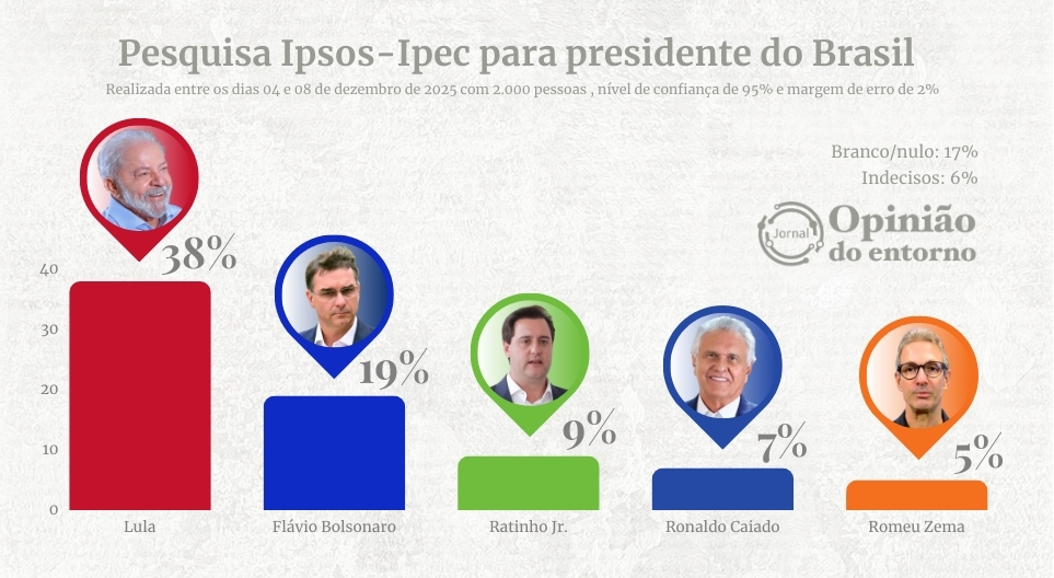 Neste cenário, os governadores do Paraná, Ratinho Jr. (PSD), de Goiás, Ronaldo Caiado (União), e de Minas Gerais, Romeu Zema (Novo), aparecem com 9%, 7% e 5%, respectivamente. Votos em branco e nulos são 17% e não sabem ou não responderam, 6%.