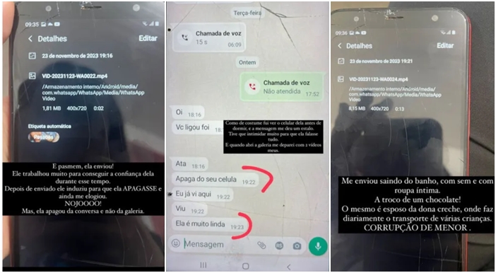 "E pasmem, ela enviou! Ele trabalhou muito para conseguir a confiança dela durante esse tempo. Depois de enviado ele induziu para que ela apagasse e ainda me elogiou. Nojo! Mas, ela apagou da conversa e não da galeria. Tive que intimidar muito para que ela falasse tudo. E quando abri a galeria me deparei com dois vídeos meus", relatou Laiane.