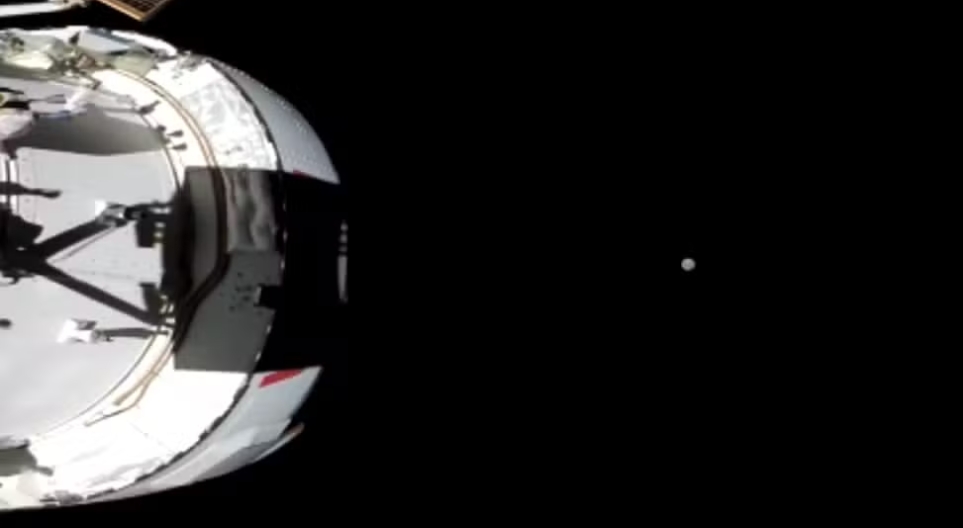 Nas imagens da transmissão da NASA da missão Artemis II já é possível observar, em alguns instantes a Lua. Nessa quinta-feira (2), a tripulação da Orion alterou a rota e agora está em direção à órbita lunar.