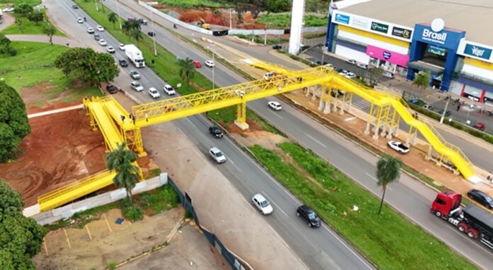 A passarela amarela sobre a BR-040, agora em frente ao Brasil Center, em Valparaíso de Goiás, foi liberada para a passagem de pedestres na tarde desta quarta-feira (17), 137 dias após a sua desmontagem. A desinterdição após a conclusão da montagem foi realizada pela equipe do Departamento Nacional de Infraestrutura de Transportes DNIT e resolve uma situação que vinha causando transtornos e insegurança para quem atravessa a via diariamente.