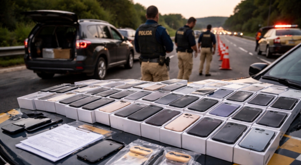 O veículo foi abordado pouco depois de passar por uma praça de pedágio e, durante a vistoria, os agentes detectaram o acabamento do porta-malas havia sido adulterado. Quando o forro externo foi removido, os iPhones foram encontrados, escondidos na própria lataria do carro.